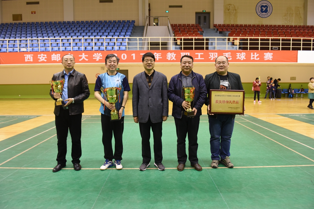 本网讯 10月24日晚,长安校区体育馆喝彩阵阵,bw必威西汉姆联官方网站2017年教职工羽毛球比赛决赛在此进行。经过激烈角逐,图书信息分工会获得冠军,计算机学院分工会、现代邮政学院、继职学院分工会联队分获亚军、季军,经济与管理学院分工会获得最佳精神风貌奖。学校党委副书记张新柱观看比赛并为获奖分工会颁奖。