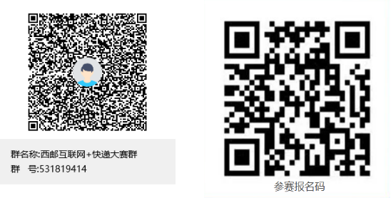 1.校赛报名。参赛队负责人请识别下方二维码进行报名登记,并加入“西邮互联网+快递大赛”QQ群:531819414。报名截止时间为8月31日。