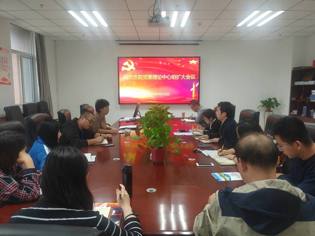 【研究生院党委】9月11日下午,研究生院党委召开理论学习中心组(扩大)学习会议,会议由党委书记高向鹏主持,研究生院领导班子、党委理论学习中心组成员、各党支部书记参加了会议,学校主题教育第五巡回指导组组长、电子工程学院党委书记吕军战到会指导。高向鹏领学了习近平总书记在“不忘初心、牢记使命”主题教育工作会议的重要讲话精神。研究生院副院长、教工支部书记王沛学习传达了学校党委理论学习中心组(扩大)学习会议精神。吕军战学习传达了学校巡回指导组工作实施方案并提出工作要求。高向鹏对研究生院“不忘初心、牢记使命”主题教育下一步工作进行了安排,要求部门全体党员要以习近平新时代中国特色社会主义思想为指导,充分认识开展主题教育的重大意义,准确把握主题教育的目标要求,紧扣立德树人根本任务,结合各学科支部特色,以高度的政治感、责任感、使命感深入推进各项工作,确保主题教育取得实效。