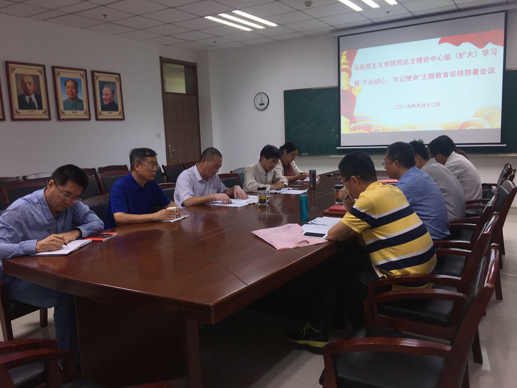 【马克思主义学院党总支】9月12日下午,马克思主义学院党总支召开理论学习中心组(扩大)会议,安排部署学院“不忘初心、牢记使命”主题教育。学校主题教育领导小组第四巡回指导组组长高向鹏、学院党总支委员、处科级干部、支部书记、教研室主任参加会议。学院党总支书记马智主持会议。马克思主义学院院长袁武振领学了习近平总书记在“不忘初心、牢记使命”主题教育工作会议上的重要讲话。副院长袁文伟传达了学校“不忘初心、牢记使命”主题教育安排部署会精神。马智传达了学校“不忘初心、牢记使命”主题教育安排部署会精神,并对学院“不忘初心、牢记使命”主题教育进行了安排部署。他要求全体党员统一思想、提高认识,明确目标、扎实推进,干部示范、力求实效,着力解决突出问题,紧扣目标要求,抓好责任落实,推动主题教育见功见质见效,奋力完成学院追赶超越专项任务、开创马克思主义学院建设新局面。高向鹏解读了《关于开展“不忘初心、牢记使命”主题教育巡回指导工作的实施方案》,强调要提高政治站位,增强责任担当,夯实工作责任,落实领导责任,力戒形式主义,确保扎实有效。