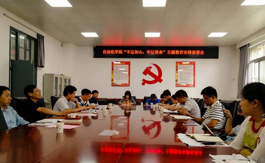 【自动化学院党委】9月12日中午,自动化学院召开“不忘初心、牢记使命”主题教育安排部署会,学院党委委员、处科级干部、支部书记、系部主任参加会议,第一巡回指导组组长、纪委副书记刘进海参加会议,院长王文庆主持会议。副院长屈军锁领学习近平总书记在“不忘初心、牢记使命”主题教育工作会议上的重要讲话精神。党委书记刘国营传达了学校党委理论学习中心组(扩大)学习会议精神,对学院“不忘初心、牢记使命”主题教育进行了安排部署。刘进海解读了《关于开展“不忘初心、牢记使命”主题教育巡回指导工作的实施方案》,并就做好主题教育提出三点要求:一是提高政治站位,增强责任担当,把思想和行动统一到习近平总书记的重要讲话精神和中省的决策部署上来;二是学院党委要精心组织,扎实推进,牢牢把握主题教育目标要求,把主题教育各项要求落到实处;三是夯实工作责任,落实领导责任,突出真抓实干,做到统筹兼顾,确保主题教育全面取得扎实成效。参会人员表示将严格按照学校和学院的安排部署,把开展“不忘初心、牢记使命”主题教育与落实立德树人根本任务相结合,与推动学院追赶超越相结合,以扎实的工作成效助推学校建设发展。