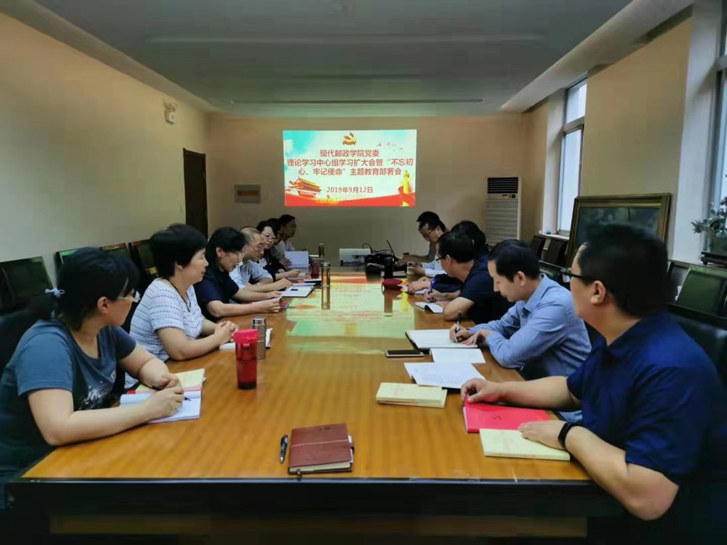 【现代邮政学院党总支】9月12日下午,现代邮政学院党委召开理论学习中心组学习(扩大)会议暨“不忘初心、牢记使命”主题教育部署会。学院党委理论学习中心组成员、领导班子、各党支部书记、系部中心主任参加会议,学校主题教育第二巡回指导组组长、纪委监察处处长王颖到会指导。会议由现代邮政学院院长、行政和学工支部书记薛蓉娜主持。党委书记郭琪传达了学校党委理论学习中心组(扩大)学习会议精神,对学院“不忘初心、牢记使命”主题教育进行了安排部署。他要求学院全体党员要以习近平新时代中国特色社会主义思想为指导,充分认识开展主题教育的重大意义,紧扣立德树人根本任务,立足本职岗位,开拓创新,勇于进取,坚持把开展主题教育与推动学院工作结合起来,确保主题教育全面取得扎实成效。王颖传达了学校《关于开展“不忘初心、牢记使命”主题教育巡回指导工作的实施方案》精神,并就学院进一步做好主题教育要求大家提高政治站位,切实把思想和行动统一到习近平总书记的重要讲话精神和中省的决策部署上来,牢牢把握主题教育目标要求,结合学校追赶超越工作实际,突出特色,以扎实的工作成效助推学校建设发展。与会人员纷纷表示将严格按照学校和学院的部署安排,认真开展好主题教育,以钉钉子的精神推动学院各项工作又快又好发展,以实际行动践行初心和使命。