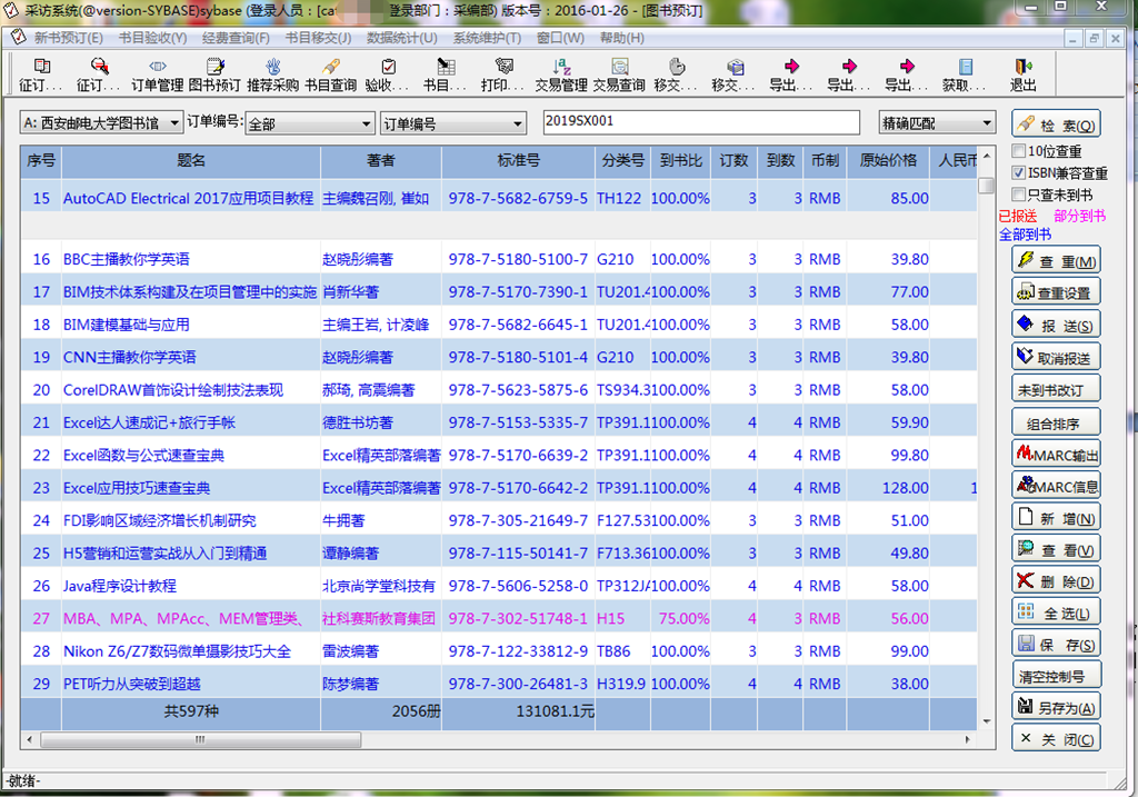 采访信息化保证每一本图书追溯到准确的订货时间、人员、采访形式,保证每一笔订单在后续业务流程中有准确的对应处理程序,直至完成。验收信息化实现对每一笔订单所订图书的数量和金额进行到馆校对,充分结合必威西汉姆联的专业设置对实到图书的专业性、前沿性、可读性进行总体评估和考量,将不符合采访原则和实际需求的图书及时剔除。