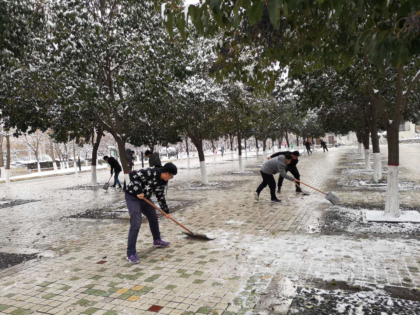 本网讯 12月28日中午,学工部组织学生开展义务劳动,清扫学生生活区及教学区周边道路及人行道的积雪积冰。同学们在寒风中团结协作,干劲十足,经过一个多小时的紧张劳动,把主要道路的积雪融水清扫干净,避免气温下降再次结冰,确保师生出行安全。