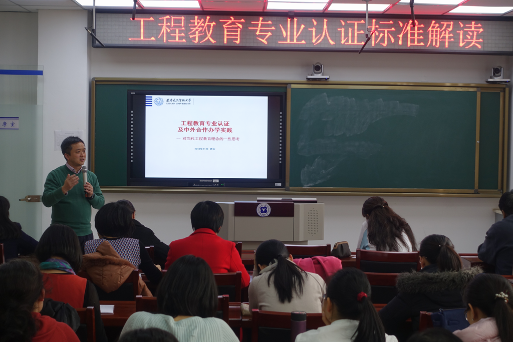 本网讯 11月27日下午,教学质量监控与评估办公室邀请中国工程教育专业认证协会专家、西安电子科技大学李勇朝教授在长安校区东区教师发展中心作题为《工程教育专业认证标准解读》报告。报告会由教学质量监控与评估办公室主任阴亚芳主持,各相关学院副院长、专业负责人及任课教师参加活动。