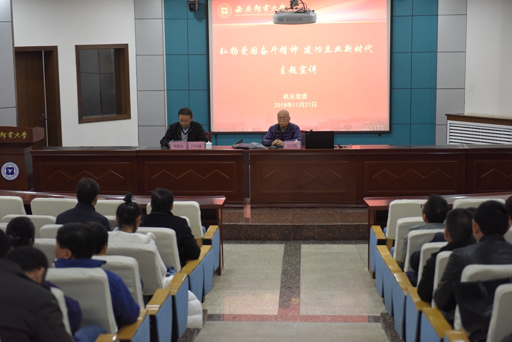 宣讲会上,马青俊作为一位在学校学习工作60多年的老西邮,作为西邮建设发展的亲历者,用朴实而又生动的语言,从西邮办学的“两个阶段”、“三个层次”和“四个校址”谈起,详细介绍了西邮68年筚路蓝缕的发展历程,再现了扶风建校、学生办邮、恢复建校、扩大规模、提升层次等发展历史,深刻阐释了几代西邮人以实际行动践行“爱国奋斗精神”,践行“爱国、求是、奋进”的校训,为中国邮电通信事业建功立业。从忠于党的教育事业的责任心等五个方面,诠释了“艰苦创业、自强不息、开拓进取”的西邮精神。袁文伟作了题为《新形势下加强党建总要求和新途径》的主题宣讲,以扎实的理论功底,从准确把握党的建设总要求、深刻领会党的建设总路线等方面,对党的十九大关于党的建设的重要精神,进行了深入解读和阐释。对新形势下党建面临的严峻形势进行了客观的分析,从重新塑造党的意识形态、坚持巩固基层党组织、奋力开辟党的伟大事业等方面,提出了新形势下加强党的建设的新途径,指出狠抓党建必须坚持解放思想改革创新,必须坚持执政能力建设和纯洁性建设,必须坚持党要管党,从严治党。通过主题宣讲,对于更好学习老一辈知识分子的爱国奋斗精神,传承、弘扬爱国奋斗精神,更好理解和把握新形势下加强党建总要求和新途径,立足岗位勇奉献,建功立业新时代,具有很好的现实指导意义。