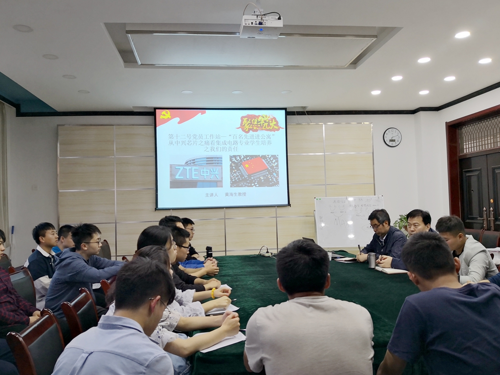 本网讯 4月26日晚上,电子工程学院十二号党员工作站在电院会议室开展“百名先进”进公寓座谈会,邀请电子工程学院黄海生教授作《从中兴芯片之痛看集成电路学生培养之我们的责任》专题讲座,集成电路设计与集成系统专业的30余位学生参加讲座,座谈会由电子工程学院党委书记马斌奇主持。