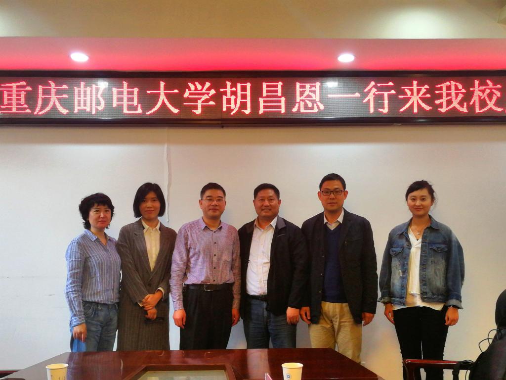 本网讯 4月26日下午,重庆邮电大学校友联谊会秘书长、产学研合作办公室副主任胡昌恩一行来必威西汉姆联调研校友和产学研工作,与必威西汉姆联校友工作办公室、科技处相关人员进行座谈。