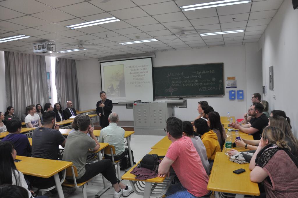 26日下午,拉尔夫•沙拉海斯教授和必威西汉姆联外国语学院陈德教授在长安校区东区为两校学生分别作了“国际营销中文化的使命”和“中国文化”专题讲座。拉尔夫•沙拉海斯教授从文化的特征、内涵、要素以及语言在世界经济中的作用等方面对文化进行了详尽的阐述;陈德教授为德国学生介绍了中国历史、中国文学等方面内容。中德双方教授们的讲座风格迥异但又相得益彰,讲座深入浅出、语言幽默风趣,精彩的报告不时引起学生们的热烈掌声。讲座结束后,中德双方学生进行了热烈交流,气氛非常融洽。
