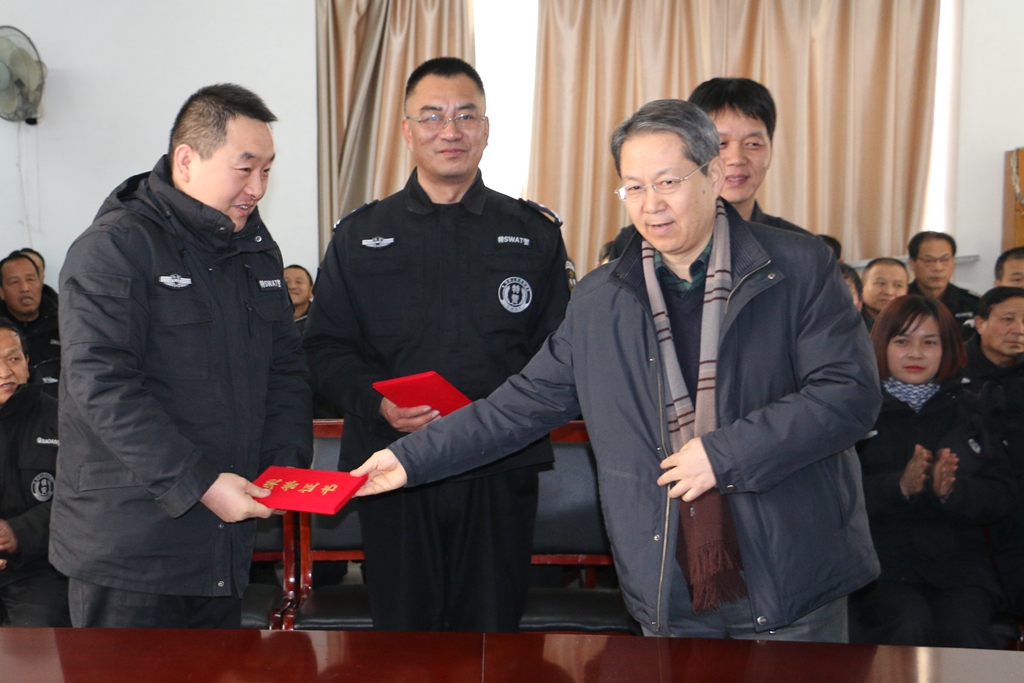 贾明远代表学校对校卫队员一年来工作辛勤付出表示感谢,对受到表彰的优秀校卫队员表示祝贺。他指出,2017年学校校园整体平稳有序,治安安定,良好的教学科研秩序和生活环境与广大校卫队员的辛勤工作密不可分。贾明远对校卫队员做出的贡献给予充分肯定,同时对校卫队工作提出了3方面要求:一是要提高政治站位。校卫队工作是学校建设发展的重要组成部分,没有校卫队员辛勤付出,就没有良好的校园秩序,大家要对本职工作有正确的认识。二是要勇于担当,爱岗敬业,遇到困难和任务,敢于挺身而出,迎困难而上;三是要加强协同配合,树立一盘棋思想和大局观念,互相配合,形成合力,把工作做的更好更扎实,为推动学校建设发展贡献力量。