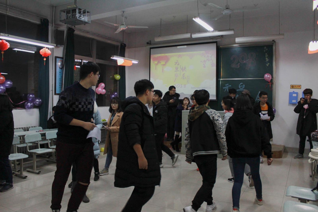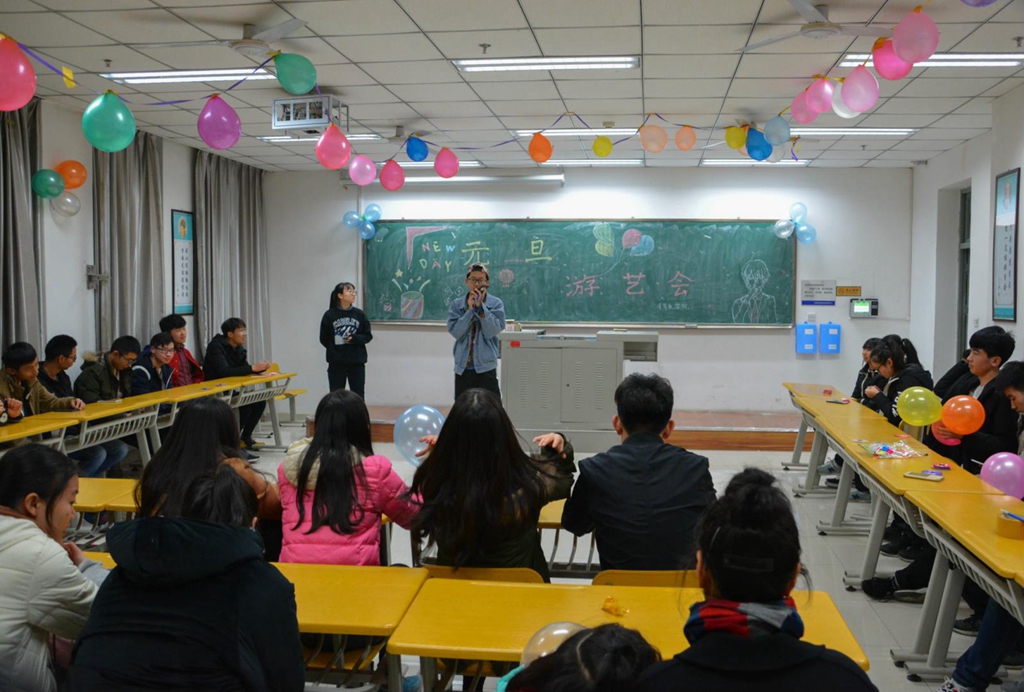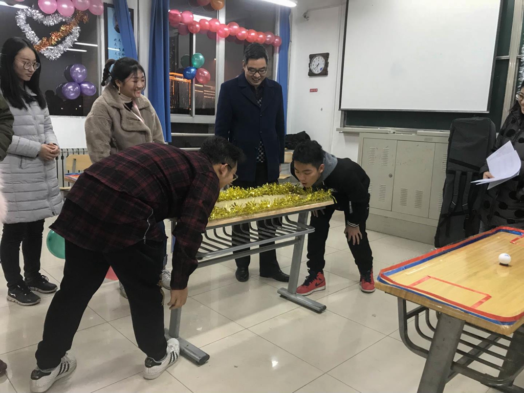 晚7时,由各分团委主办的游艺活动在各教学楼内举行。各院开展的活动形式多样,内容丰富,有让人惊叹的才艺串烧,轻松愉悦的小游戏,如“大家请抱拳”、“传纸杯”,也有富有挑战的活动,如“一反常态”、“迷满天空”等。良好的氛围吸引了众多师生的积极参与。副校长安增旺在活动现场对同学们表示亲切慰问,祝愿大家元旦快乐,希望同学们在临近考试期保持一个良好的心态,合理安排时间,适当放松,认真备考。